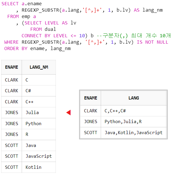 WHERE REGEXP_SUBSTR(a.lang, '[^,]+', 1, b.lv) IS NOT NULL