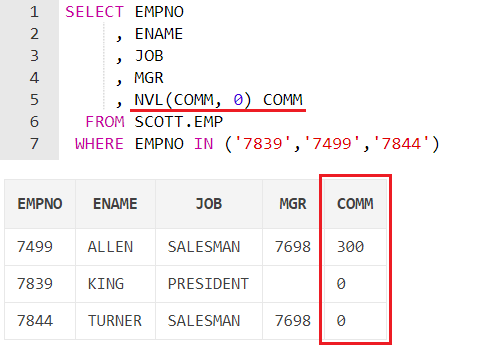 ▲ COMM 칼럼이 NULL인 경우 "0"으로 표시