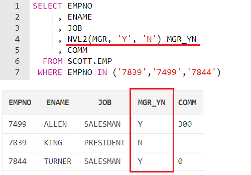 NVL2 함수를 사용할 때 NULL이 아닌경우 자신의 값을 그대로 출력할 수도 있다.