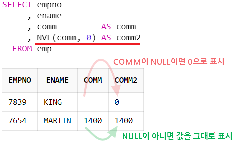 , NVL(comm, 0) AS comm2 --커미션이 NULL 이면 '0'