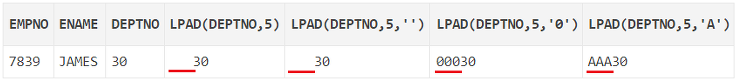 , LPAD(deptno, 5, 'A') -- 왼쪽에 'A'를 채움