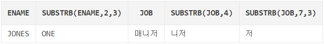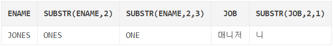 SUBSTR(ename, 2, 3): 문자열의 두 번째 위치("O")부터 세 자리("ONE")까지 자른다.