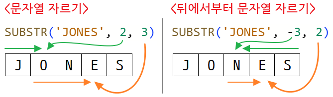 SUBSTR(ename, -3): 문자열의 뒤에서 세 번째 위치("N")에서 문자열 끝까지 자른다.