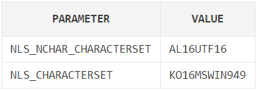 한글을 지원하는 문자셋은 KO16KSC5601(2byte), KO16MSWIN949(2byte), UTF8(3byte), AL32UTF8(3byte)가 있다.