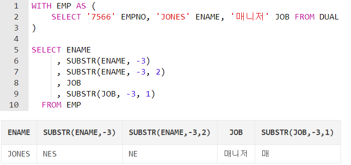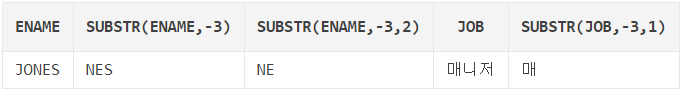 SUBSTR(ename, -3, 2): 문자열의 뒤에서 세 번째 위치("N")에서 두 자리("NE")까지 자른다.