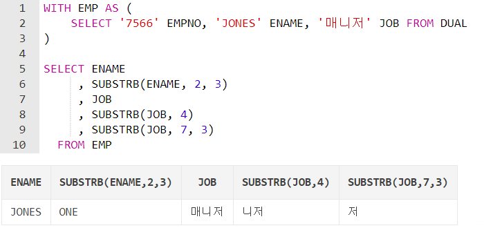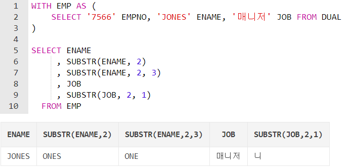 SUBSTR(ename, 2, 3): 문자열의 두 번째 위치("O")부터 세 자리("ONE")까지 자른다.