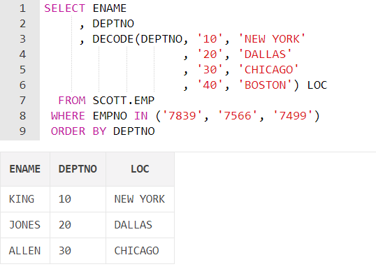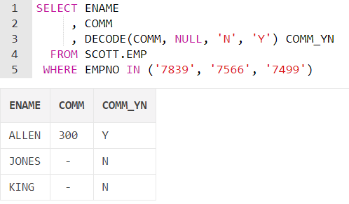 예) DECODE(컬럼, 조건1, 결과1, 조건2, 결과2, 조건3, 결과3..........)