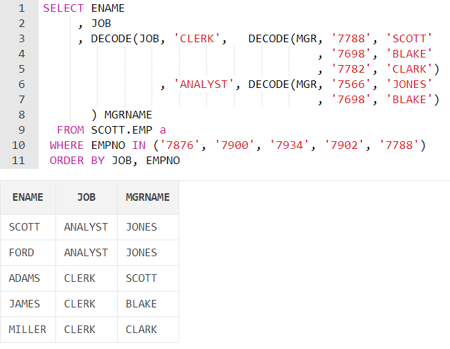 ▲ DECODE 함수 내부에 또 다른 DECODE 함수를 사용할 수 있다