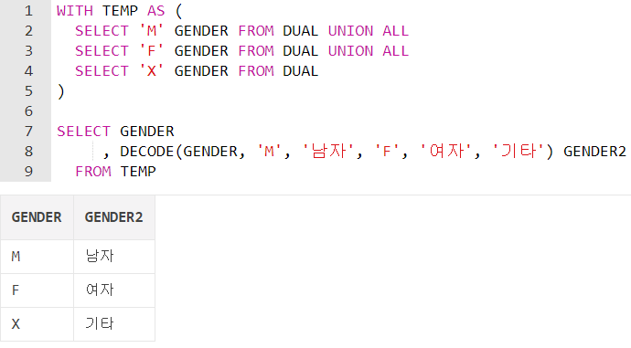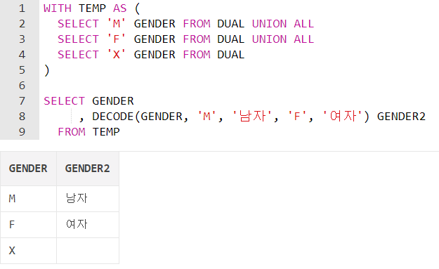 DECODE 함수는 오라클 쿼리에서 가장 많이 사용하는 함수 중 하나이다. 표준 SQL 함수가 아니라서 사용을 꺼려하기도 하지만 잘 사용하면 아주 편하기 때문에 유용하다. 최근에는 CASE WHEN 구문 사용을 많이 권장하기도 한다.
