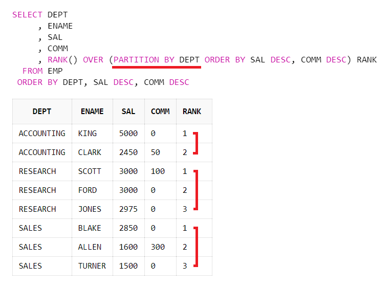 , RANK() OVER (PARTITION BY DEPT ORDER BY SAL DESC, COMM DESC) RANK