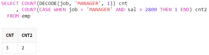 - COUNT( ) 함수 내부에 DECODE 함수나 CASE문 등을 사용하여 건수를 집계 할 수 있다.