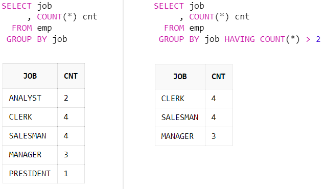 - WHERE 절에는 COUNT( ) 함수를 사용할 수 없지만, HAVING 절에는 조건으로 사용 가능하다.