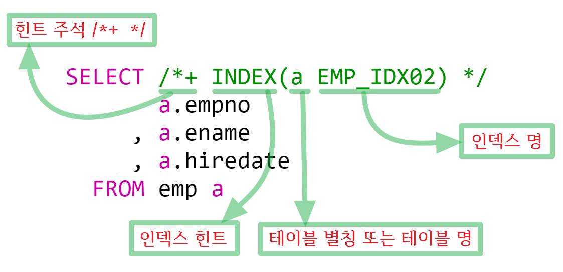 SELECT절 첫 줄에 힌트 주석(/*+ */)을 작성하여 적절한 인덱스를 부여하면 된다. 주석에 꼭 "+"를 붙여야 힌트절이 실행되며 "+"가 없으면 일반 주석으로 간주하고 아무런 이벤트가 없다.