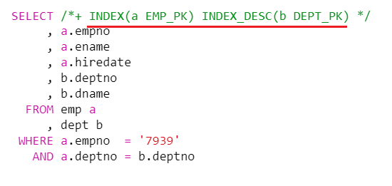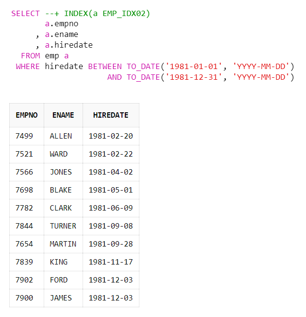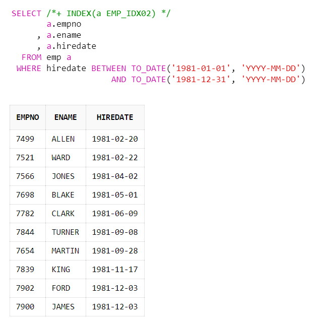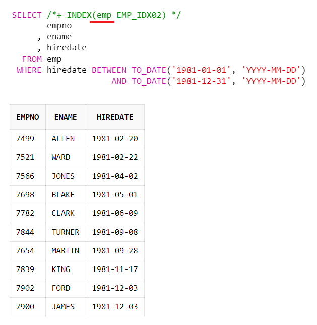 SELECT /*+ INDEX(a EMP_IDX02) */