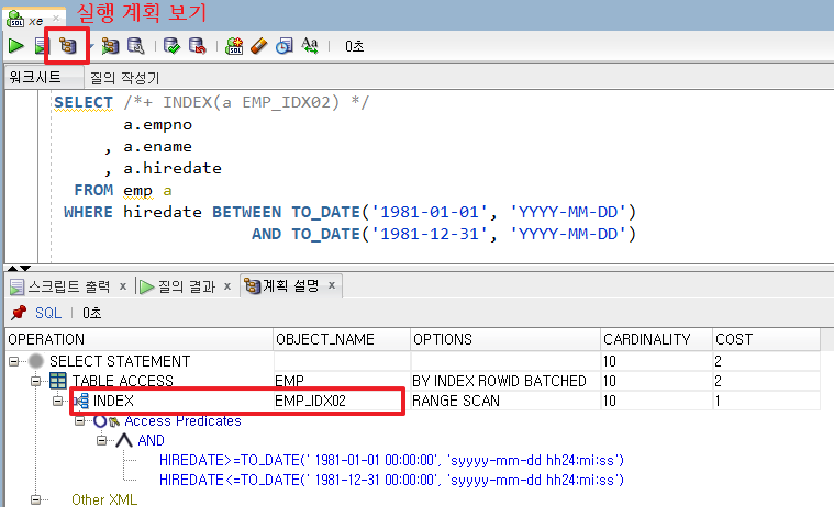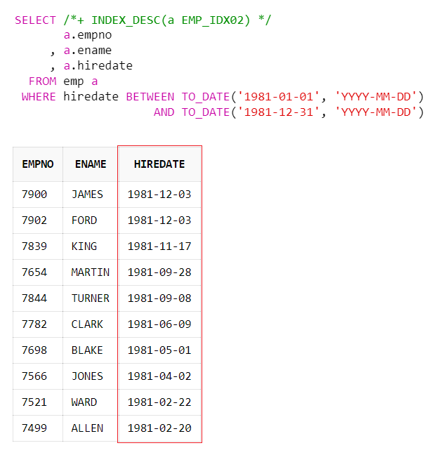 EMP_IDX02 인덱스는 HIREDATE, DEPTNO 컬럼으로 구성되어 있으며 WHERE절에 HIREDATE 기준으로 데이터를 조회할 경우 사용한다. 만약 EMPNO로 조회한다면 EMP_PK 인덱스를 사용해야 한다.