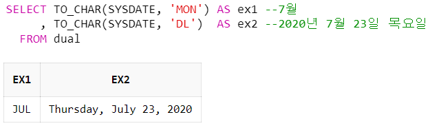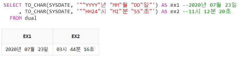 SELECT TO_CHAR(SYSDATE, '""YYYY"년 "MM"월 "DD"일"') --2020년 07월 23일