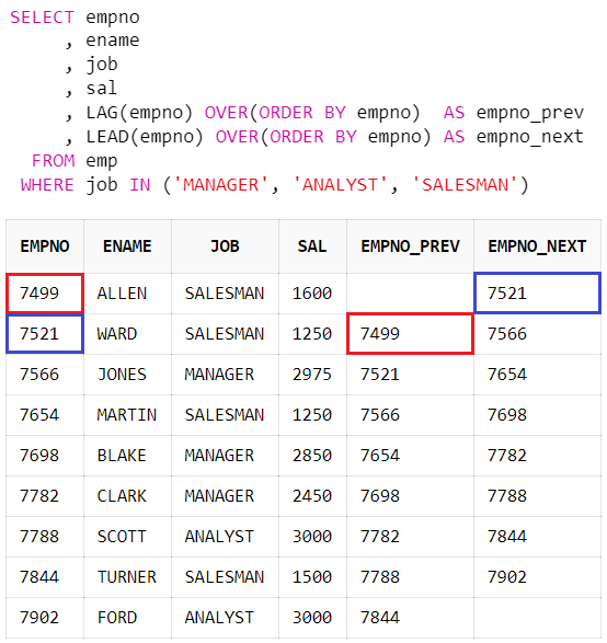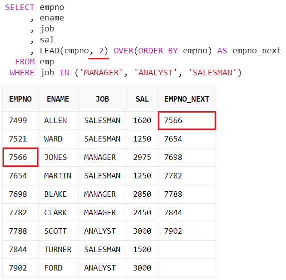 , LEAD(empno, 2) OVER(ORDER BY empno) AS empno_next
