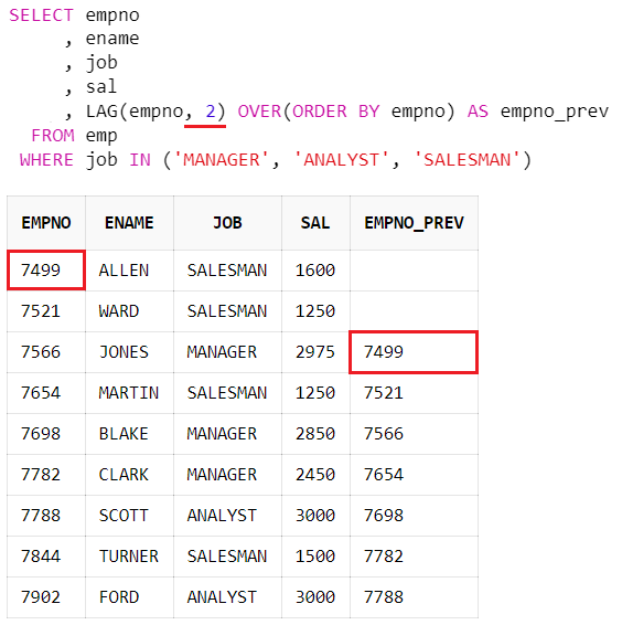 , LAG(empno, 2) OVER(ORDER BY empno) AS empno_prev