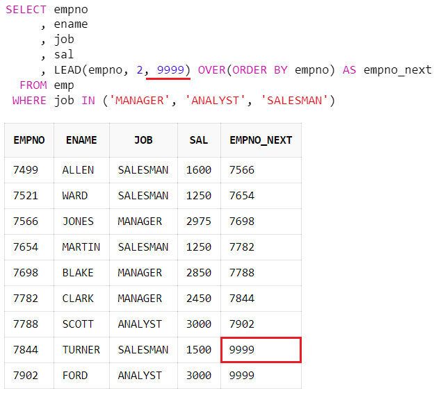 , LEAD(empno, 2, 9999) OVER(ORDER BY empno) AS empno_next