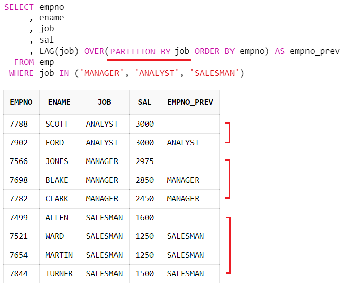 , LAG(job) OVER(PARTITION BY job ORDER BY empno) AS empno_prev