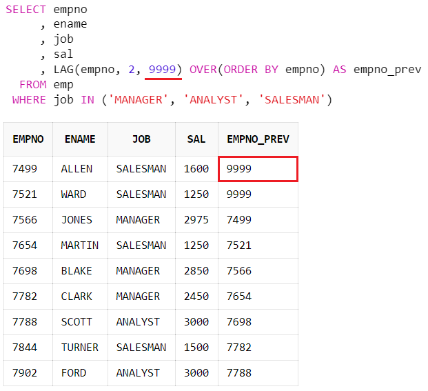 , LAG(empno, 2, 9999) OVER(ORDER BY empno) AS empno_prev
