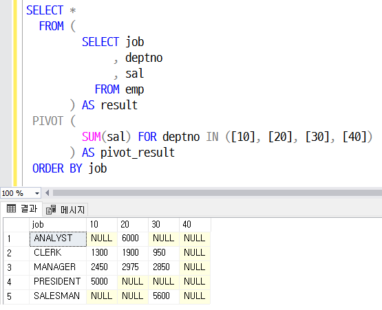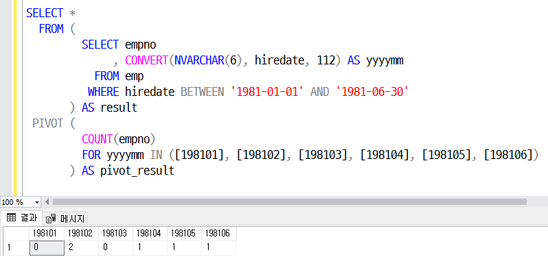 | SELECT * FROM ( 피벗할 쿼리문 ) AS result PIVOT ( 그룹합수(집계컬럼) FOR 피벗대상컬럼 IN ([피벗컬럼값] ... ) AS pivot_result |