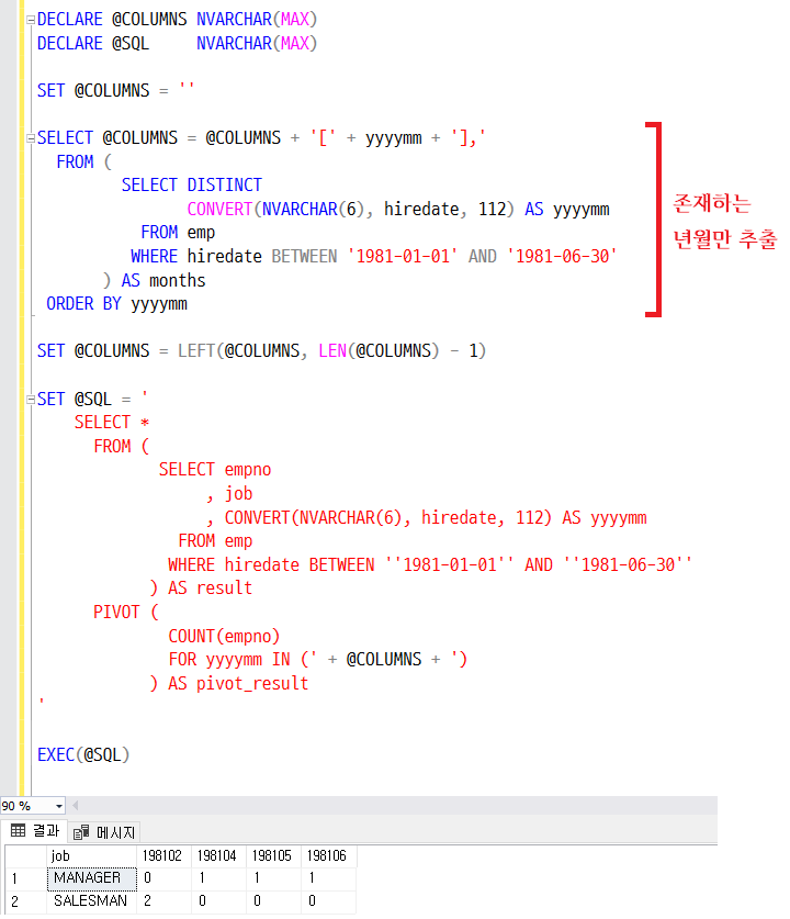 존재하는 년월만 중복을 제거하여 동적쿼리문에 적용하면, 피벗 컬럼 값을 지정하지 않고 조회한 데이터에 존재하는 값만 피벗 컬럼으로 출력된다.