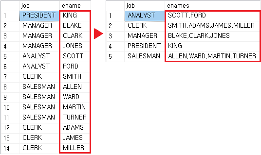SQL Server에서 여러 행(Row)의 컬럼 값을 하나로 합치기 위해서는 STUFF 함수와 FOR XML PATH 구문을 사용하면 된다. 오라클 SQL에서 XMLAGG, WM_CONCAT, LISTAGG 함수와 비슷한 기능을 수행한다.