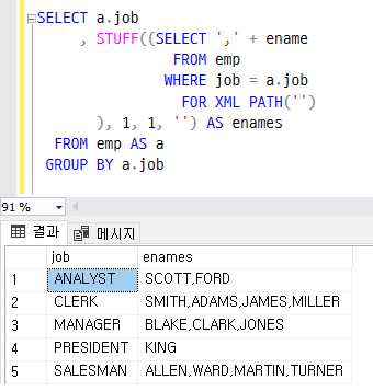 SQL Server 2017 이상 버전을 사용한다면 STRING_AGG 함수를 사용하면 된다. |