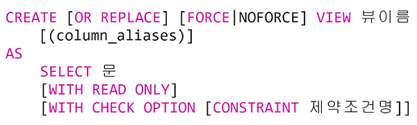 - WITH READ ONLY : SELECT 만 가능하다. (INSERT, UPDATE, DELETE 불가능)