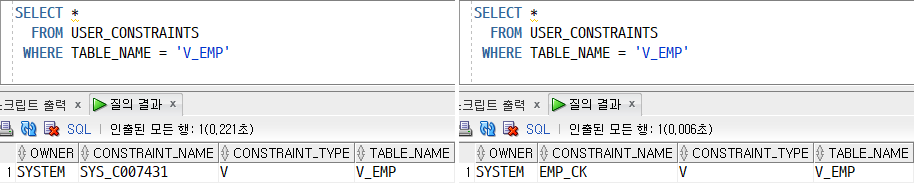 - NORORCE : 뷰를 생성할 때 쿼리문의 테이블, 컬럼 함수 등이 존재하지 않으면 생성되지 않는다.