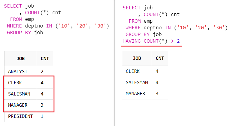 위의 쿼리문은 직군(job) 별 직원 수가 3명 이상일 경우만 조회하는 예제이다.