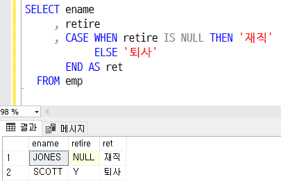 , IIF(retire IS NULL, '재직', '퇴사') AS ret