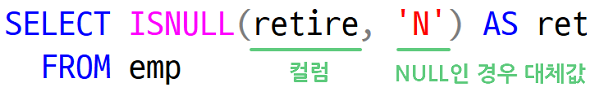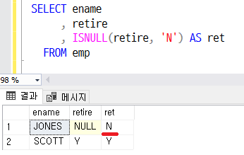 SQL Server에서는 NULL 값을 치환하기 위해서는 ISNULL 함수를 사용한다. 오라클에서 NVL 함수와 MySQL의 IFNULL 함수와 동일한 기능을 수행한다.