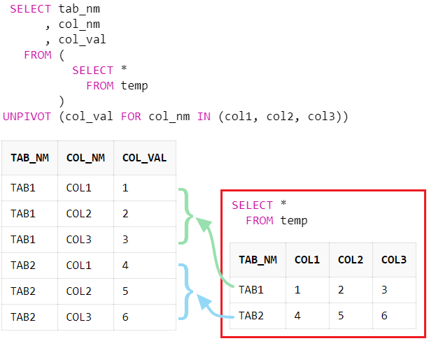 UNPIVOT 하지 않은 컬럼(tab_nm)의 값은 UNPIVOT 컬럼의 개수만큼 값이 복사되어 출력된다.