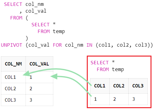 3개의 컬럼이 3개의 행으로 변환되었다. 컬럼 별칭(col_nm, col_val)은 내가 원하는 명칭으로 지정하면 된다.