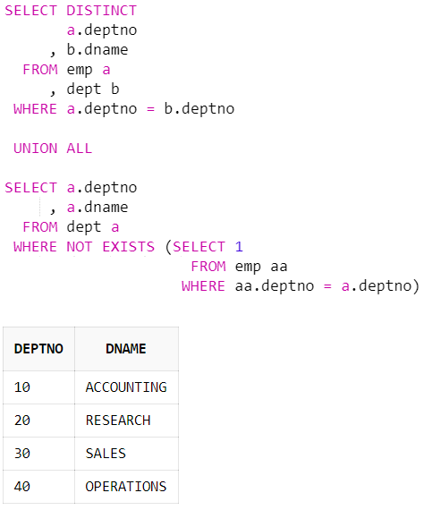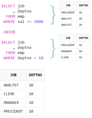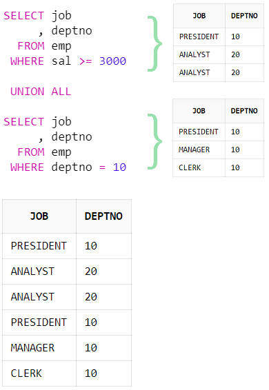 | UNION : 각 쿼리의 결과 합을 반환하는 합집합 (중복제거) UNION ALL : 각 쿼리의 모든 결과를 포함한 합집합 (중복제거 안함) |