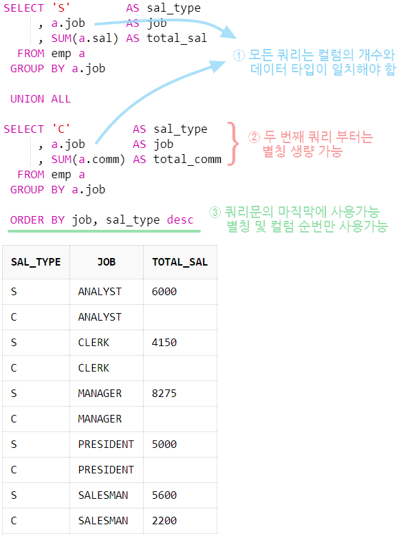 ③ ORDER BY는 마지막 한번만 사용할 수 있으며, 합쳐진 모든 결과를 정렬한다. 컬럼(a.job(X))은 사용할 수 없으며 별칭 및 컬럼 순번으로 정렬이 가능하다.