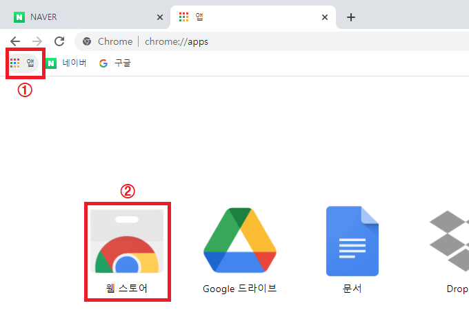 1. 크롬 북마크바에 있는 앱 메뉴에서 웹 스토어로 이동한다.