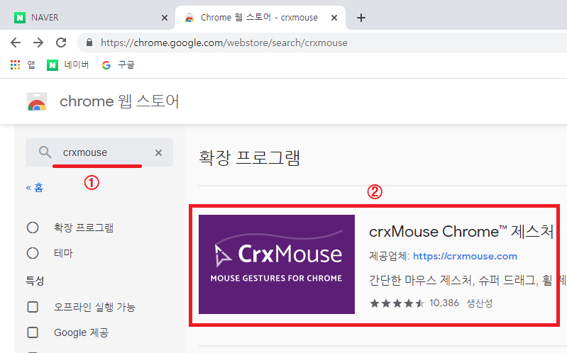 크롬 브라우저에서 CrxMouse 확장 프로그램을 사용하면 마우스 체스처를 사용하여 편하게 웹서핑을 할 수 있다. 페이지 뒤로가기, 앞으로가기, 탭 이동, 탭 닫기 등을 마우스 만으로 가능하여 아주 좋다.