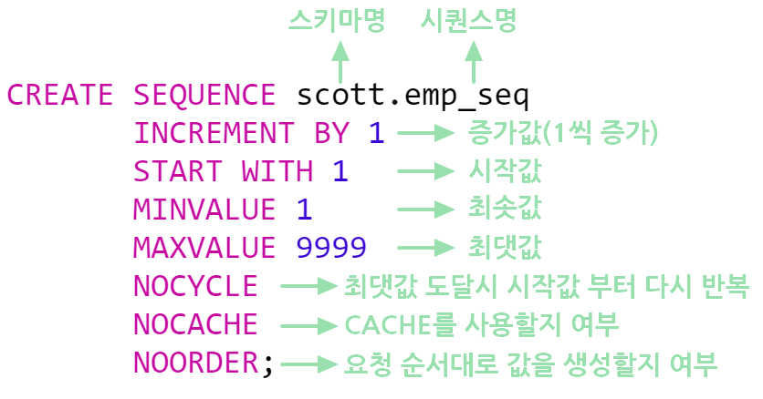 - INCREMENT BY : 시퀀스 실행 시 증가시킬 값