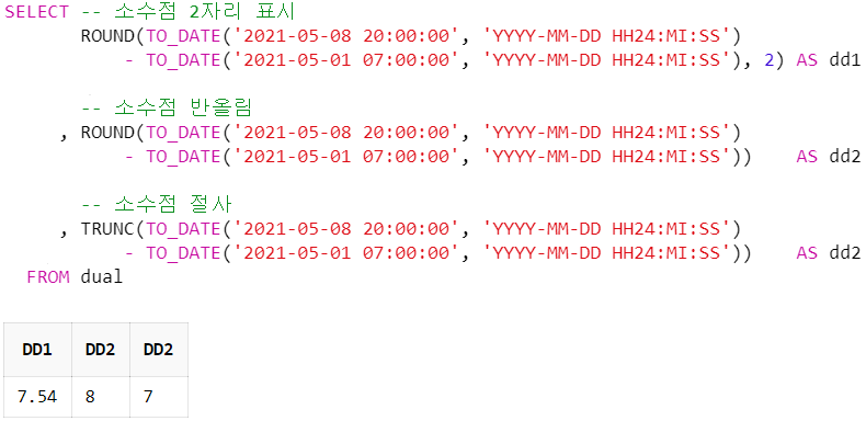 계산된 값에 소수점 값이 발생항 경우 처리하는 방식에 따라서 최종 결과가 틀려질 수 있으니 주의해야 한다. ROUND 함수를 사용하여 소수점을 표시하거나 반올림할 수 있고, TRUNC 함수를 사용하여 소수점을 절사 할 수 있다.