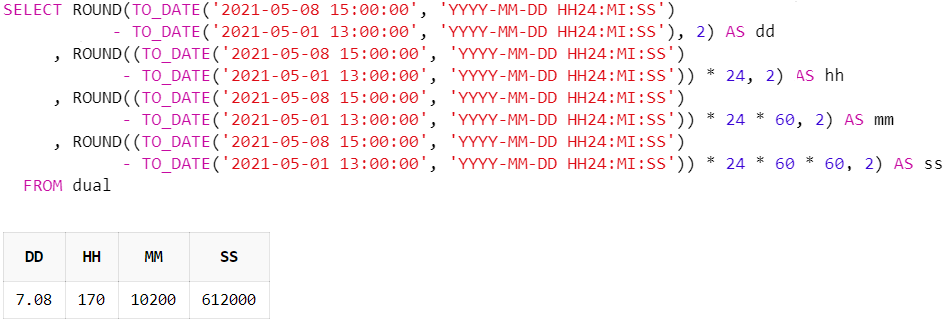 - TO_DATE('2021-05-01 13:00:00', 'YYYY-MM-DD HH24:MI:SS')) * 24, 2) AS hh