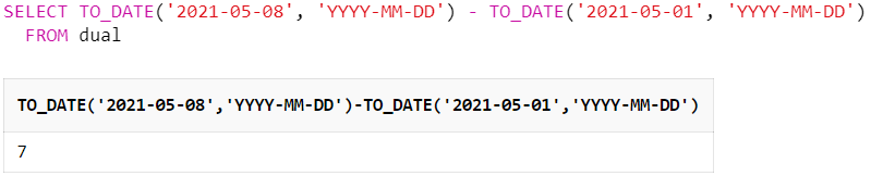 SELECT TO_DATE('2021-05-08', 'YYYY-MM-DD') - TO_DATE('2021-05-01', 'YYYY-MM-DD')