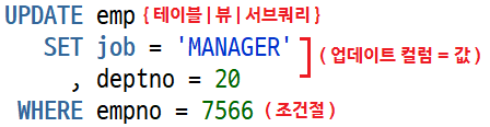 위는 WHERE 절의 empno에 해당하는 데이터의 job, deptno 컬럼을 수정하는 쿼리이다. empno는 PK이기 때문에 한건의 데이터만 수정되지만 PK가 아니고 여러 건이 조회되면 여러 건의 데이터가 한 번에 수정된다.
