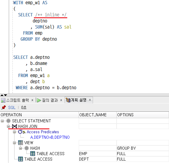동일한 WITH 절을 사용한 쿼리문 이지만 힌트에 따라서 쿼리문의 수행 방식이 달라지는 것을 확인할 수 있다.