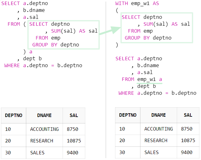 서브쿼리를 WITH 절로 만들어서 테이블을 사용하듯 사용할 수 있다. 특히 여러 번 반복되는 서브쿼리를 WITH 절로 만들어서 사용하면 쿼리의 성능을 높일 수 있다.