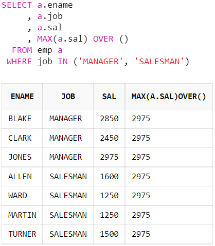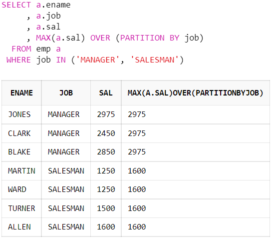 , MAX(a.sal) OVER (PARTITION BY a.job)