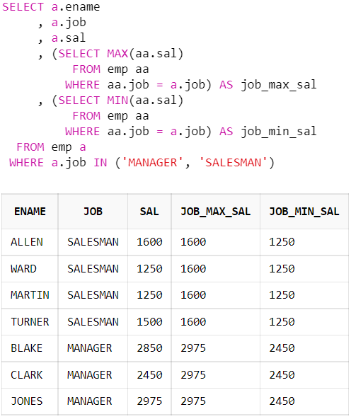 SELECT 절에서 서브쿼리를 사용하여 최대값, 최소값을 조회하는 예제이다.