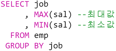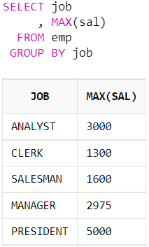 GROUP BY 절을 사용하여 직군(job) 별로 급여(sal)의 최대값(MAX)을 집계하였다.
